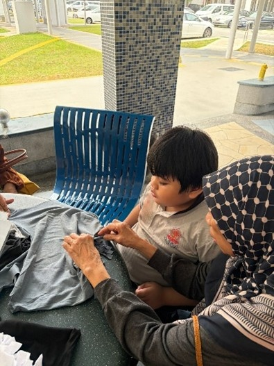 The upcycling activity was a wonderful lesson in giving old materials a new purpose. Working side-by-side, the students and Sunlove elderly transformed t-shirts into functional bags.