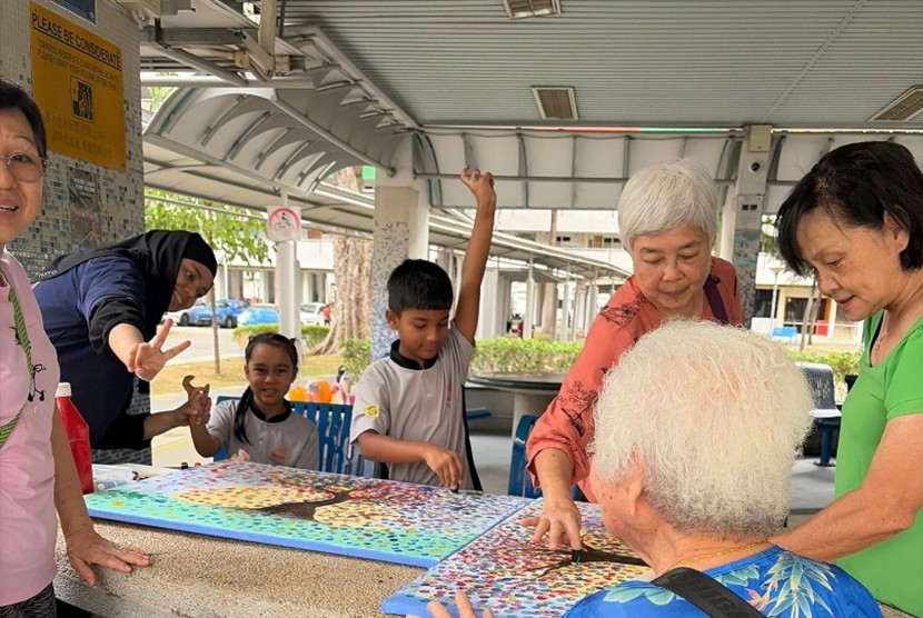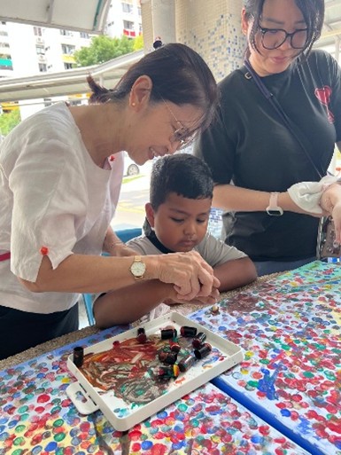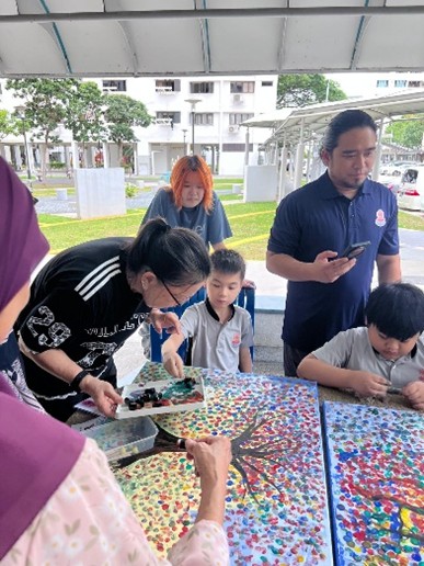 The void deck buzzed with energy as the elderly offered encouragement and students experimented with the technique, culminating in a shared sense of pride as their vibrant trees took shape.