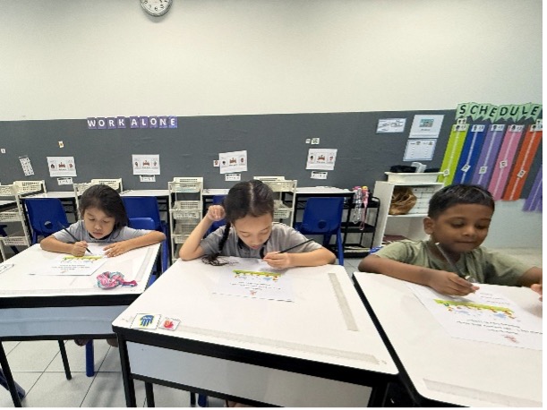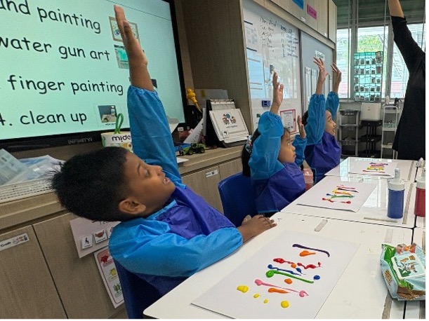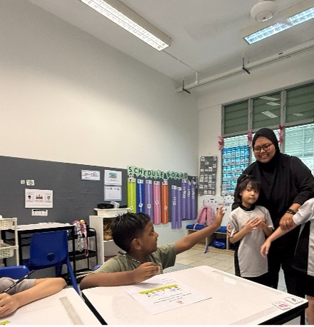 Lesson objectives were intentionally embedded throughout the session. Students were encouraged to wait patiently for their turn, raise their hands when they needed help, and practise positive social behaviours in a shared space.