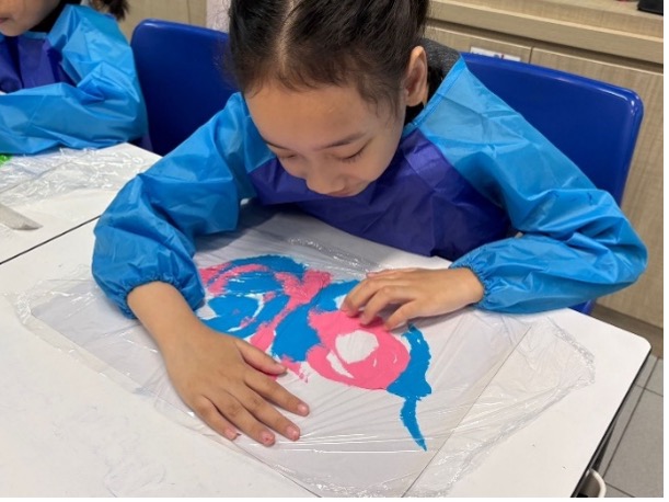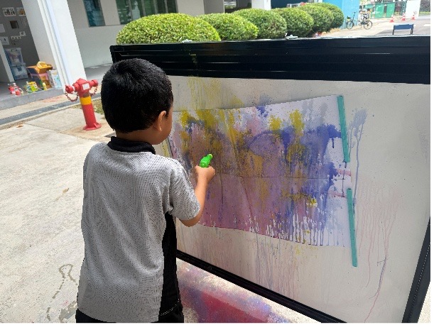 The three approaches to the medium – direct painting, cling wrap painting, and water gun painting – were designed to cater to the diverse sensory needs of the students while offering a variety of textures and artistic outcomes. Students remained highly engaged and fully immersed throughout the session.